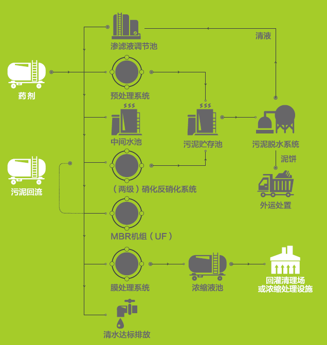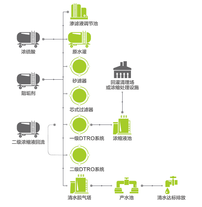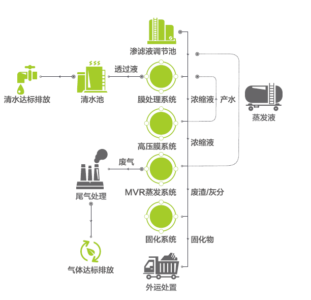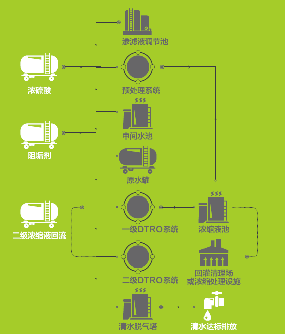 采用高壓DTRO膜分離工藝及MVR蒸發工藝,均為行業領先工藝,徹底解決垃圾滲濾液濃縮液處理的難題,從而實現垃圾滲濾液處理近零排放的目標。