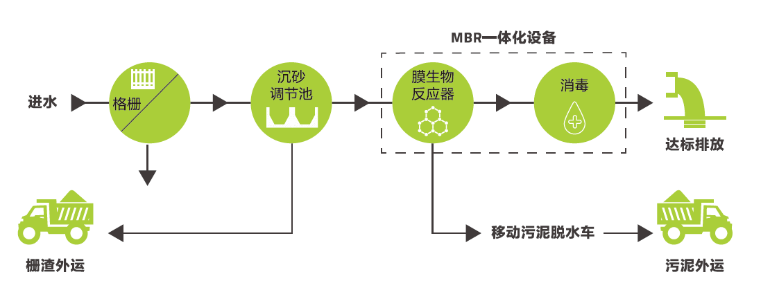 我司一體化設備采用A2O-MBR工藝,處理方法以生化為主,物理方法為輔。經由污水干管自流而來的污水首先通過廠區格柵被攔截掉大粒徑的懸浮物與漂浮物,然后流入調節池進行水質水量的調節,再經自清洗過濾器過濾后進入A2O-MBR污水處理站。一體化設備由厭氧池、缺氧池、好氧池和MBR膜組合而成,并集合紫外消毒管和電磁流量計,該裝備主要去除有機物、氨氮、SS和磷。MBR出水達標排放,剩余污泥定期排入貯泥池,通過移動污泥脫水車脫水處理后,泥餅進行填埋或綠化處置。
