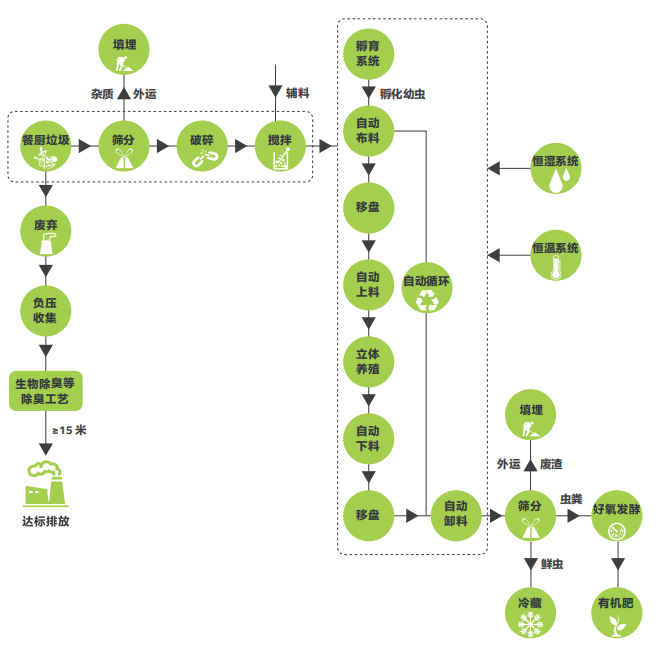 針對縣級城市餐廚垃圾為主,豆渣酒糟、禽畜糞便協同綜合處理為輔的處理規模≥25t/d,采用“智能收運 + 預處理 + 昆蟲處理技術 + 有機產品加工 + 臭氣處理”為核心處理工藝,以智能化收運、模塊化設計、自動化控制為項目服務理念,實現縣級城市餐廚垃圾處理項目建設周期短、投資成本低、附加值高的“三化”處理工藝。