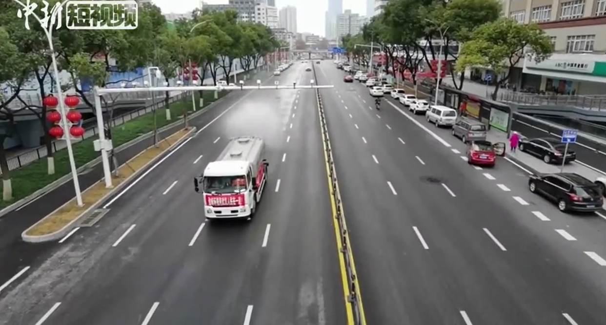 中國新聞網2月7日報道,武漢市江漢環衛一輛清潔消毒車從新華路協和醫院門口緩緩駛過,環衛司機沈義凱正在對道路進行噴霧消毒作業。